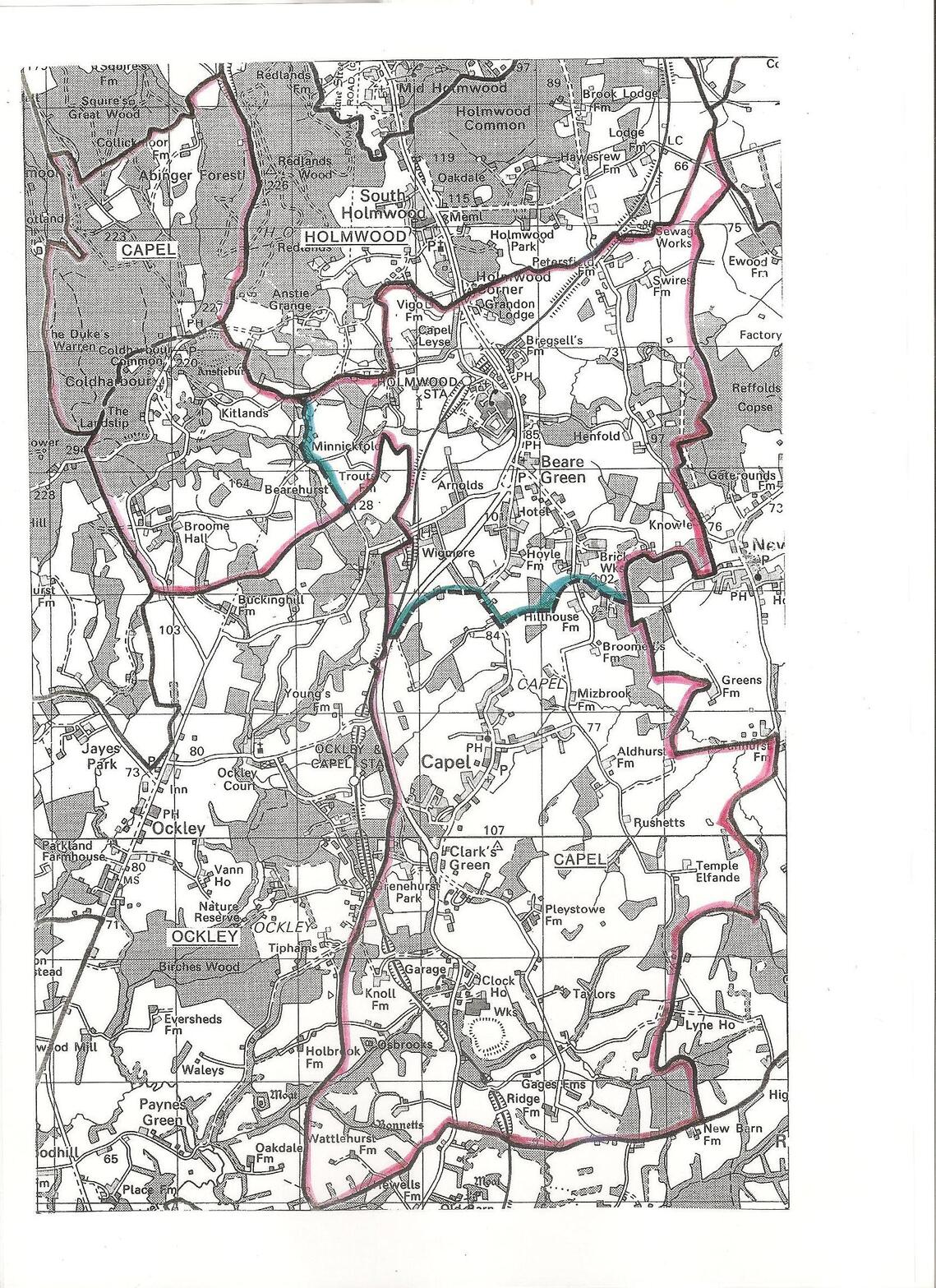 Welcome to the community web-site of Capel Parish Council (CPC) consisting of three wards namely Beare Green, Capel and Coldharbour. This map shows the parish outlined in red with the ward boundaries delineated in blue.
